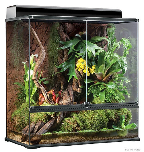 Le terrarium en verre Exo Terra, conçu par des herpétologistes européens, est l’habitat idéal pour les reptiles et les amphibiens. Les portes avant facilitent l’entretien et le nourrissage. Dimensions : 90x45x90 centimètres.