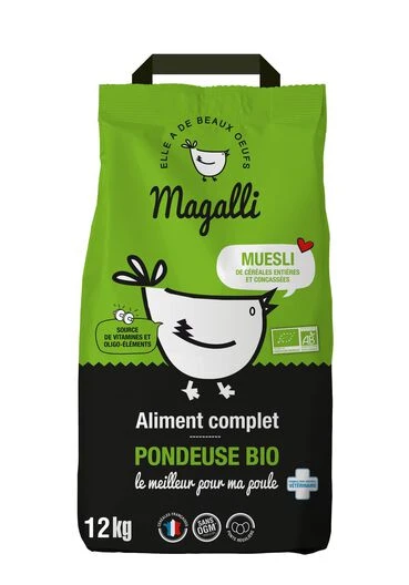 Ces trois éléments en font un aliment complet, source de vitamines, oligo-éléments et minéraux pour une poule en pleine forme. Magalli Pondeuse BIO est produit en France, avec des céréales françaises et sans OGM*.
