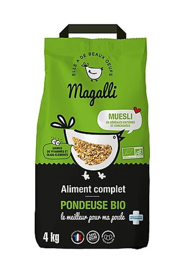 Ces trois éléments en font un aliment complet, source de vitamines, oligo-éléments et minéraux pour une poule en pleine forme. Magalli Pondeuse BIO est produit en France, avec des céréales françaises et sans OGM*.