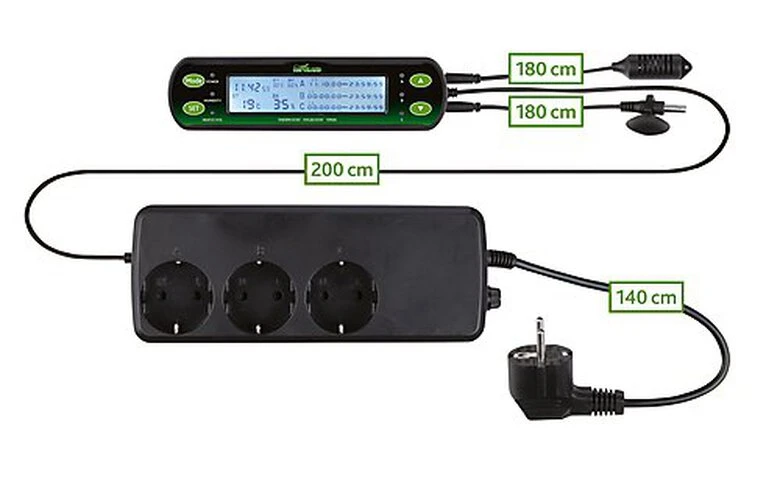 Trois circuits pour le fonctionnement diurne et nocturneAvec un raccordement de contrôle de la température et un raccordement de contrôle de l’humidité ainsi qu’un raccordement pour le timerParfait pour l’utilisation de brumisateurs ou autres sources d’humidité afin de garantir l’humidité nécessairePermet le contrôle d’une source de chaleur en fonction de la température ainsi que le contrôle d’une source d’humidité en fonction de l’humidité de jour comme de nuitUsage parfait avec les lampes et tapis chauffants et autres sources de chaleur afin d’éviter toute surchauffe ou hypothermieChaque circuit permet jusqu’à 8 programmations de ON/OFFAffichage permanent de la température, de l’humidité, du temps réel et de la fonction choisieTimer intégré (cycle min. 1 seconde)Echelle de 0 °C à 50 °CVariation de réglage de 1 °C à 15 °CPlage de contrôle de l’humidité de 20 à 90 %S’utilise pour réchauffer ou refroidirLongueur de câble de capteur : 2 × 180 cmFonction d’alarme visuelleCapacité maximum 3 × 400 WLa pile conserve les données en cas de coupure de courant