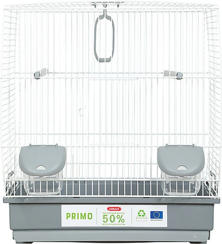 Nouvelle cage éco-conçue PRIMO Carla pour oiseaux domestiques avec bac en plastique 50% recyclé. Elle s’intègrera facilement dans les intérieurs grâce à ses coloris classiques et actuels gris clair et blanc.